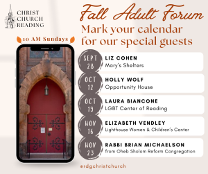 What is the Bible? How was it given to us? How can we read it today? This six-week Pilgrim Course on the Bible will help us answer all of those questions and more. Join us in the Parlor at 9:05 every Sunday as we journey with the many books and authors of the Bible.